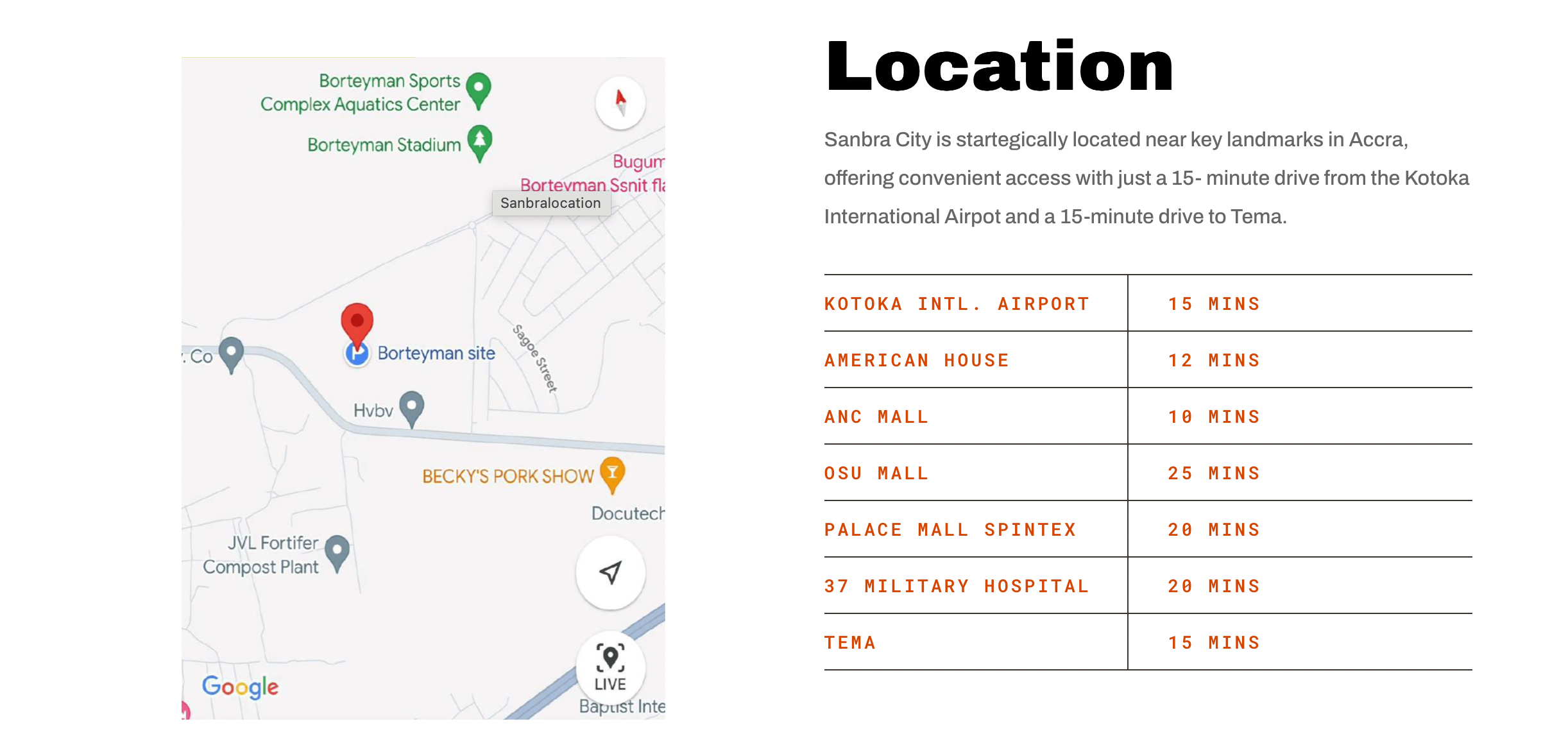 The Cascades, the first phase of the Sanbra City Development, is a 30-acre gated community located in the back gate of Borteyman, Trasacco, that offers all the best amenities of urban living within 15 minutes from Kotoka Airport and adjacent to the stadium for the All African Games.